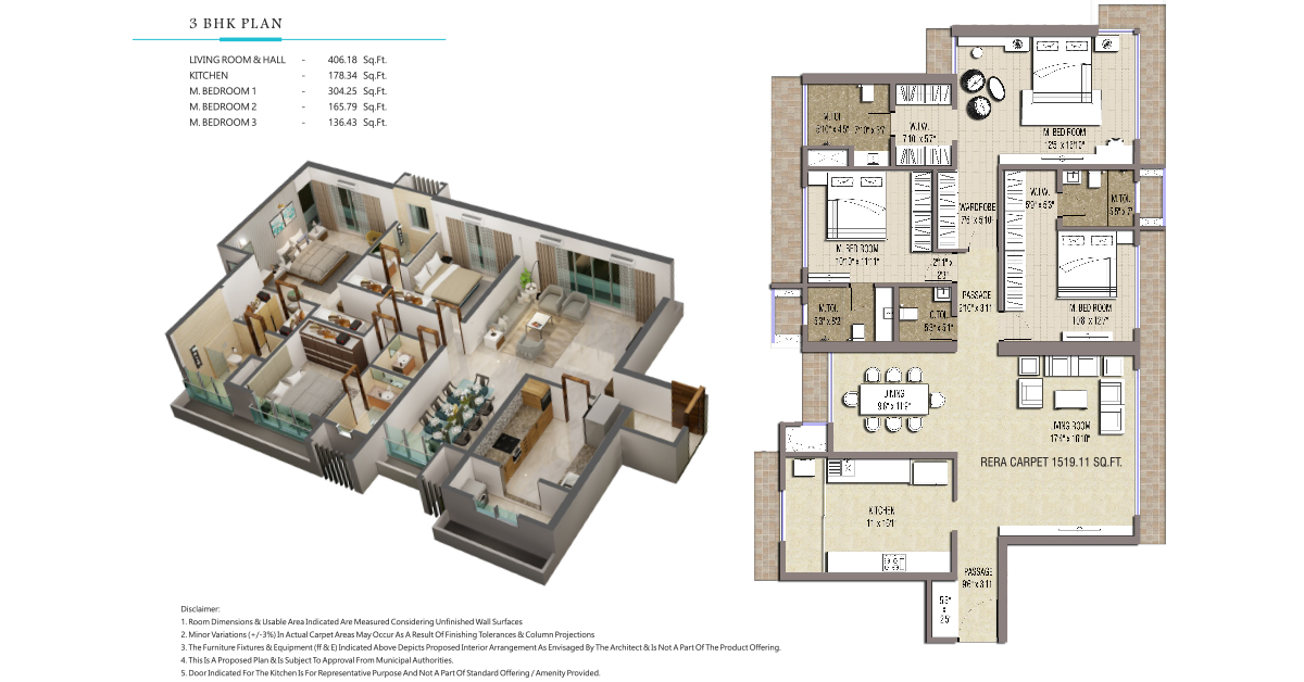 Area of 3 BHK : 1,519 Sq Ft